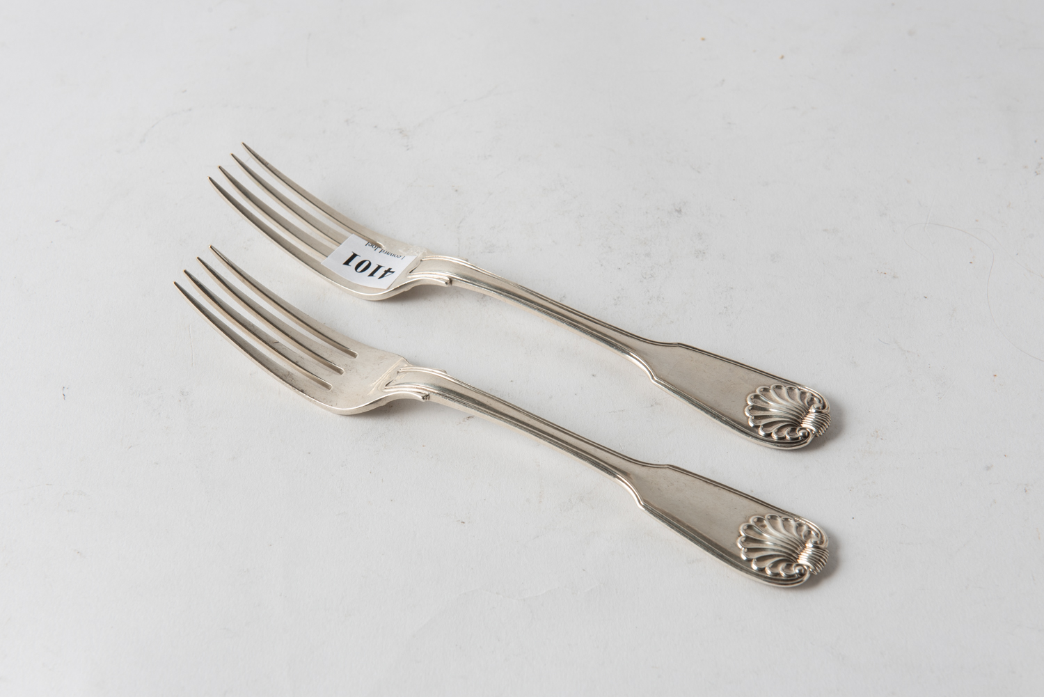 A PAIR OF GEORGE III STERLING SILVER FIDDLE THREAD AND SHELL TABLE FORKS 1828, LEONARD JOEL LOCAL DELIVERY SIZE: SMALL