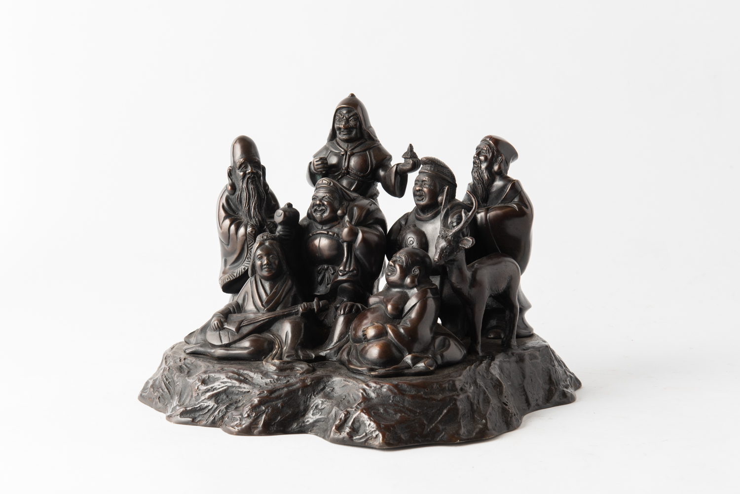 AN ORIENTAL SIGNED BRONZE FIGURE OF SEVEN WISE MEN, W.30CM, LEONARD JOEL LOCAL DELIVERY SIZE: SMALL