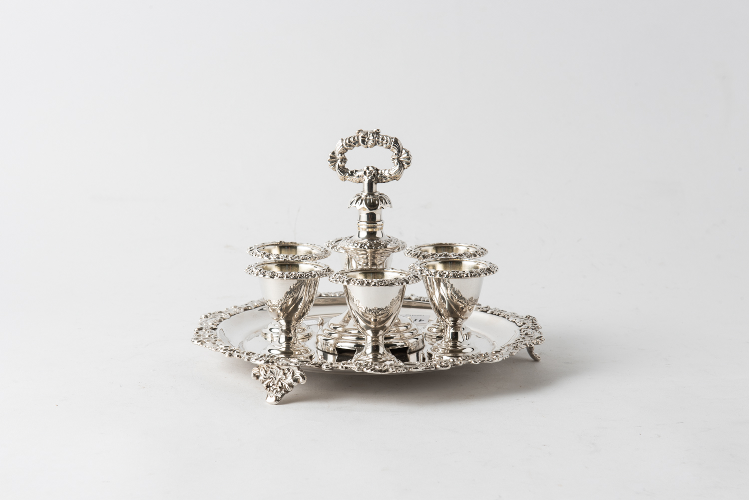 A SHEFFIELD PLATE SIX EGG CUP STAND, LEONARD JOEL LOCAL DELIVERY SIZE: SMALL