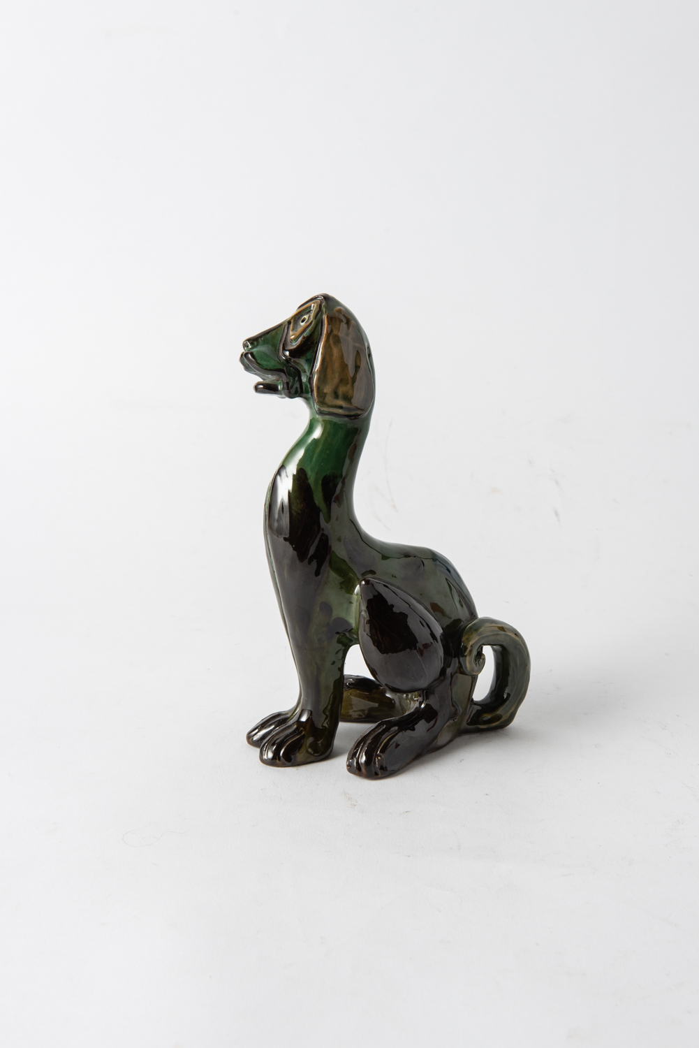 A SIGNED BARON BARNSTAPLE GREEN GLAZED DOG FIGURE, H.23CM, LEONARD JOEL LOCAL DELIVERY SIZE: SMALL