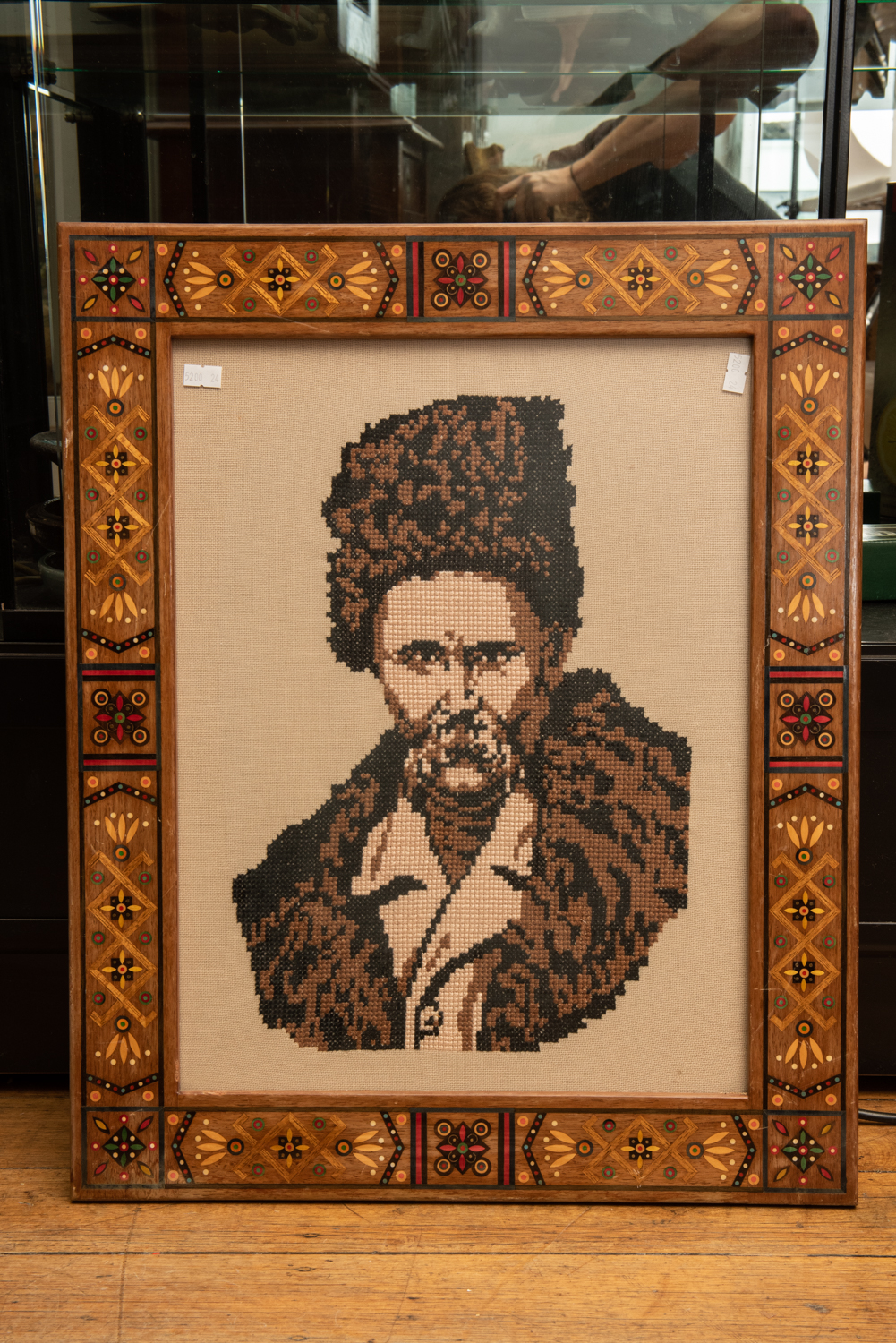 A RUSSIAN INLAID WOODEN FRAME WITH NEEDLEWORK IMAGE OF MAN, 58 X 44CM, LEONARD JOEL LOCAL DELIVERY SIZE: SMALL
