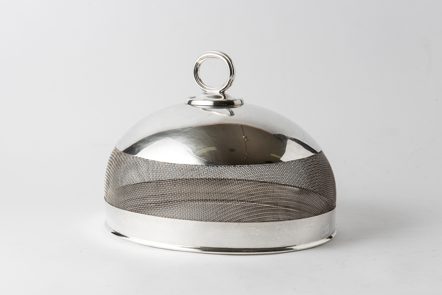 A JAMES DIXON & SONS VICTORIAN SILVERPLATE AND WIREWORK MEAT COVER WITH ORIGINAL HANGING HOOK, LEONARD JOEL LOCAL DELIVERY SIZE: SMALL