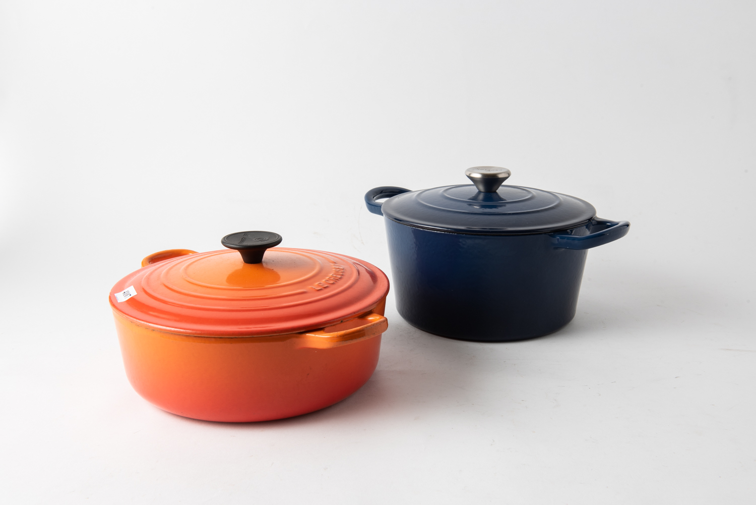 TWO CAST IRON ENAMEL POTS INCLUDING ORANGE LE CREUSET (DIA.26CM) AND BLUE CROFTON (ALDI), LEONARD JOEL LOCAL DELIVERY SIZE: SMALL