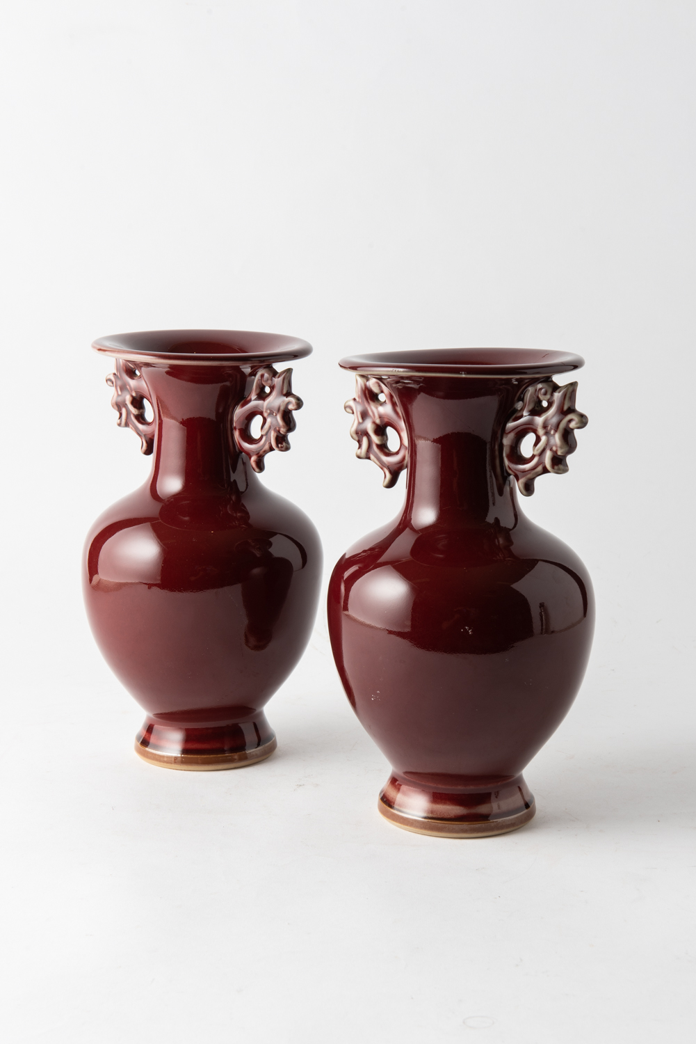 A PAIR OF SIGNED ORIENTAL PIGEON BLOOD GLAZED VASES (A/F TO ONE), 26.5 CM HIGH, LEONARD JOEL LOCAL DELIVERY SIZE: SMALL