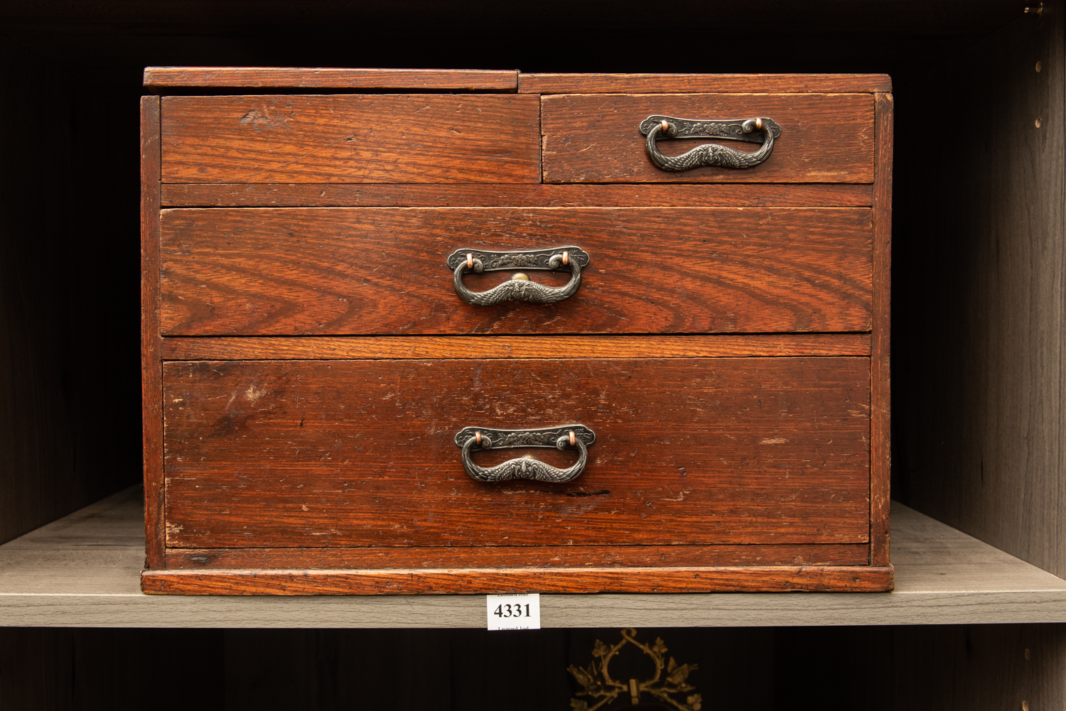 A JAPANESE WOODEN THREE DRAWER LIFT TOP SEWING CABINET WITH METAL HANDLES AND LIFT LIDDED COMPARTMENTS INSIDE, W.36CM, LEONARD JOEL LOCAL DELIVERY SIZE: SMALL