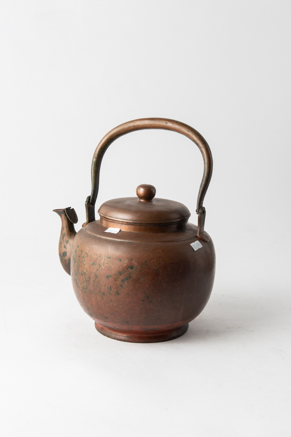 A LARGE 19TH CENTURY ORIENTAL COPPER KETTLE WITH ENGRAVED FISH SCENES AND ORIENTAL WRITING TO BOTH SIDES, H.22CM, LEONARD JOEL LOCAL DELIVERY SIZE: SMALL