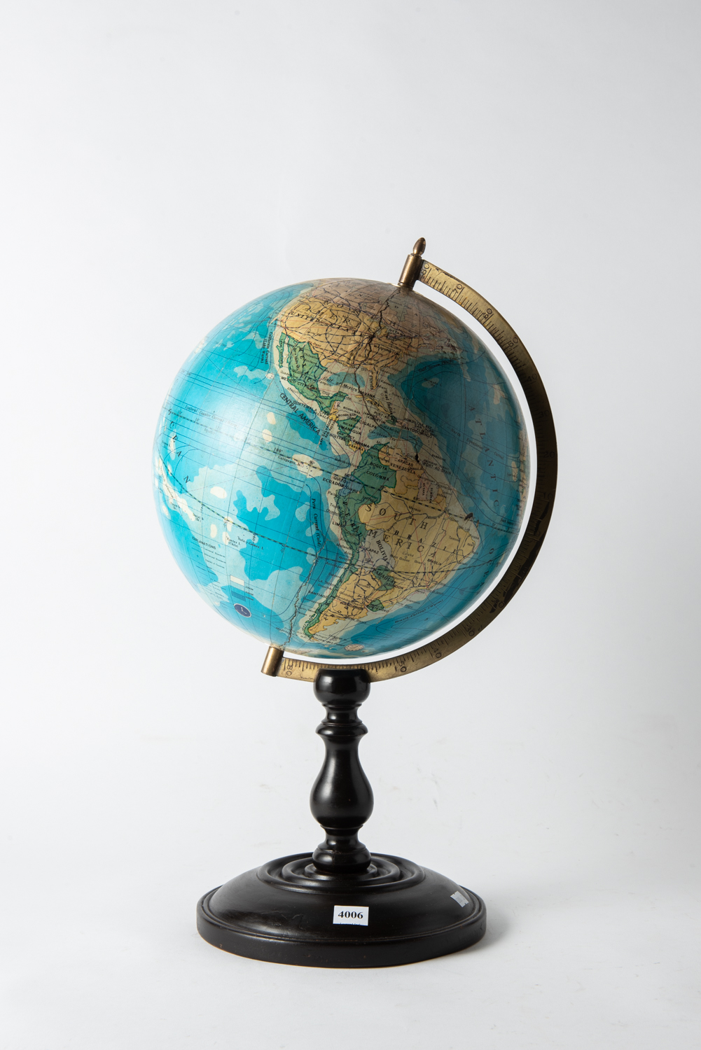 AN EBONISED BASE WORLD GLOBE WITH HEAVY BRASS RADIUS, H.52CM, LEONARD JOEL LOCAL DELIVERY SIZE: SMALL