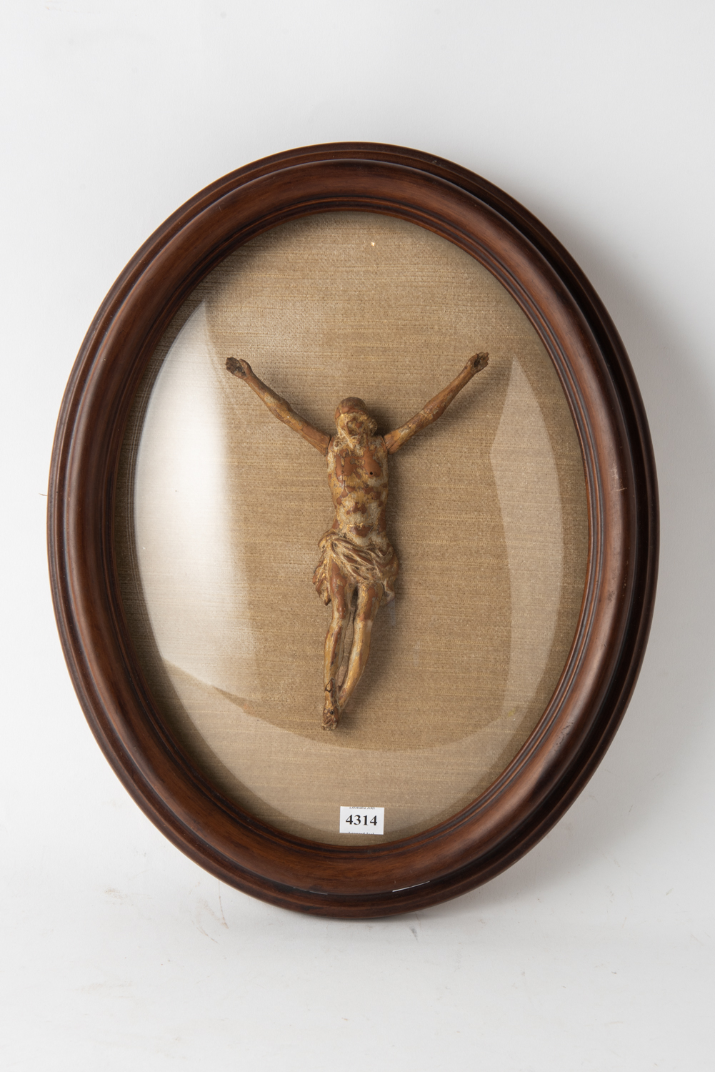 A FRENCH GESSO PAINTED WOODEN CRUCIFIX/CORPUS IN LATER OVAL WOODEN FRAME, H.44CM, LEONARD JOEL LOCAL DELIVERY SIZE: SMALL