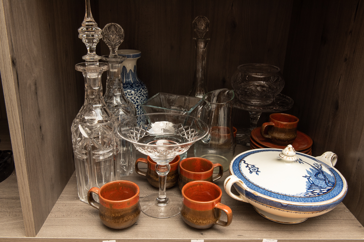 A PART SHELF OF CRYSTAL INCLUDING THREE DECANTERS (A/F) A BLUE AND WHITE VASE AND POTTERY TEA WARE, LEONARD JOEL LOCAL DELIVERY SIZE: SMALL