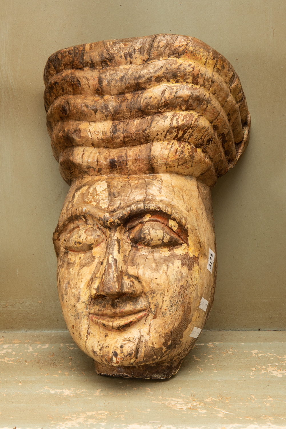 A POLYCHROME PAINTED AND CARVED WOODEN WALL MASK, H.40CM, LEONARD JOEL LOCAL DELIVERY SIZE: SMALL
