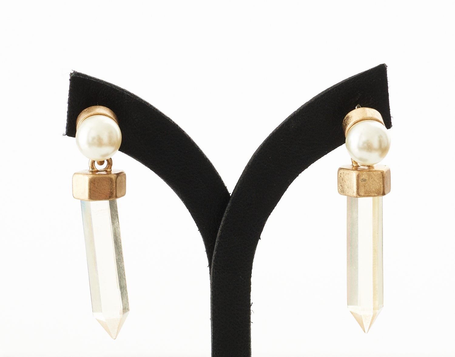 A PAIR OF QUARTZ CRYSTAL AND FAUX PEARL DROP EARRINGS, IN GILT TO POST FITTINGS, LENGTH 40MM