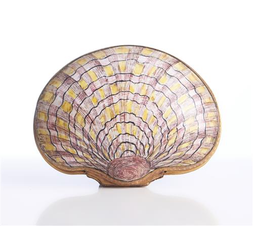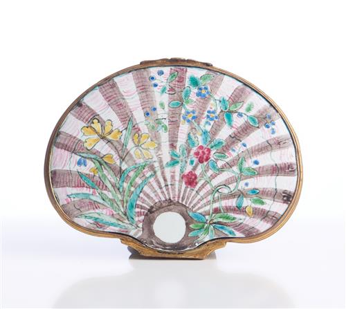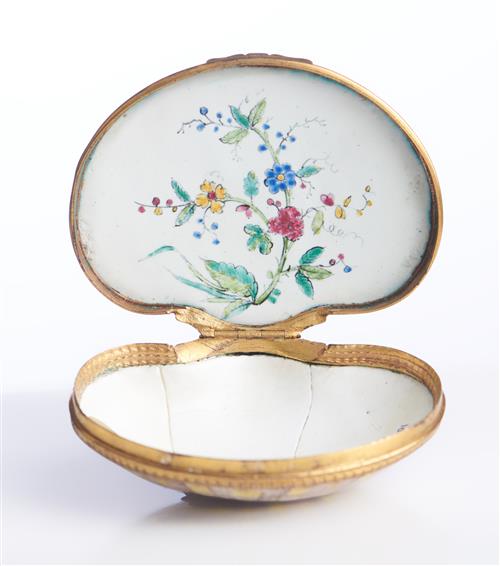 The exterior naturalistically painted as a scallop shell, the bottom and the bottom half of the interior further decorated with flowers and scrolling vines. With contemporary European gilt metal mounts and hinge. The interior bearing a label for E&J Frankel Collection, no. 164.