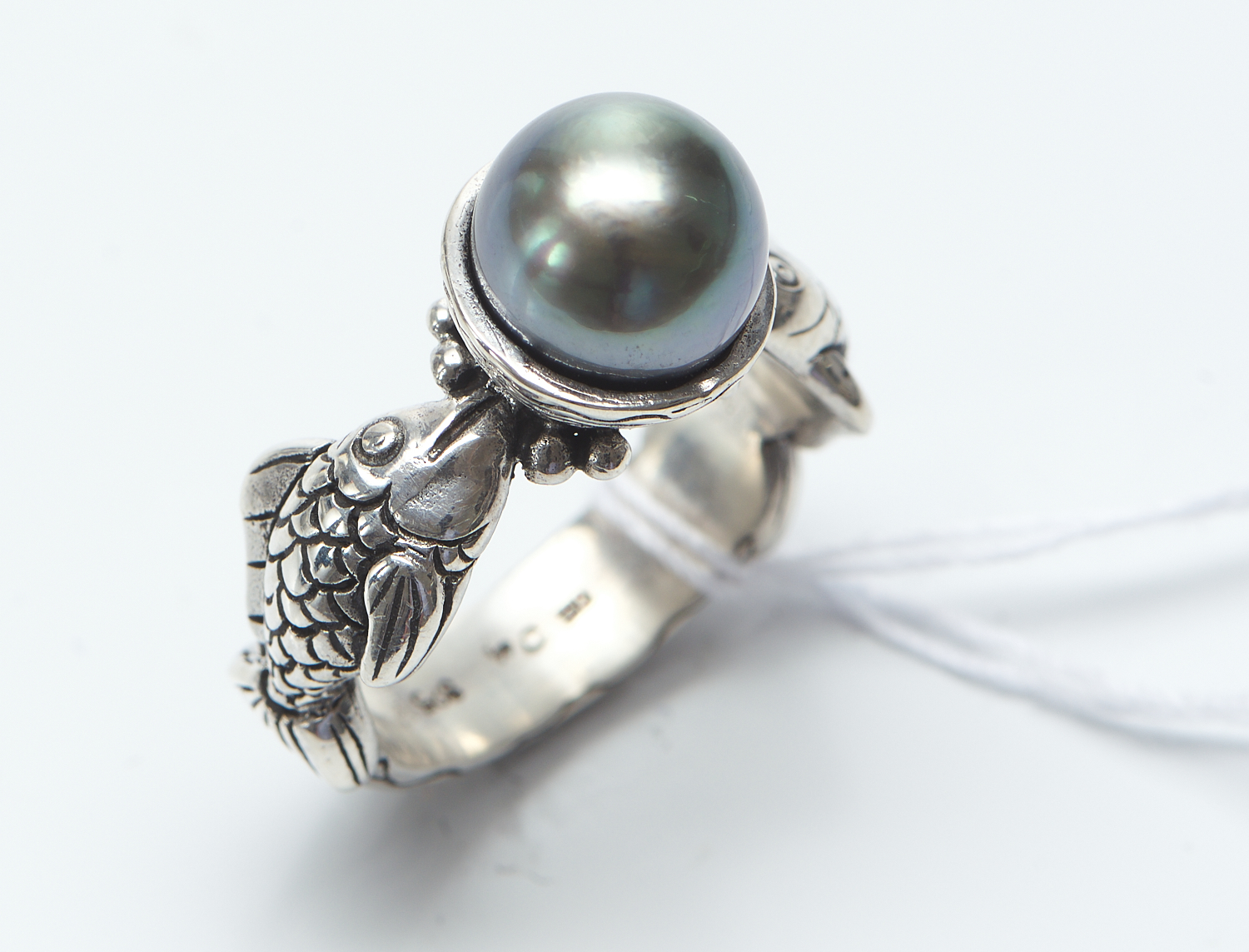 A TAHITIAN PEARL RING IN FISH DESIGN SHOULDERS IN STERLING SILVER, THE PEARL MEASURING 9.5MM, SIZE P