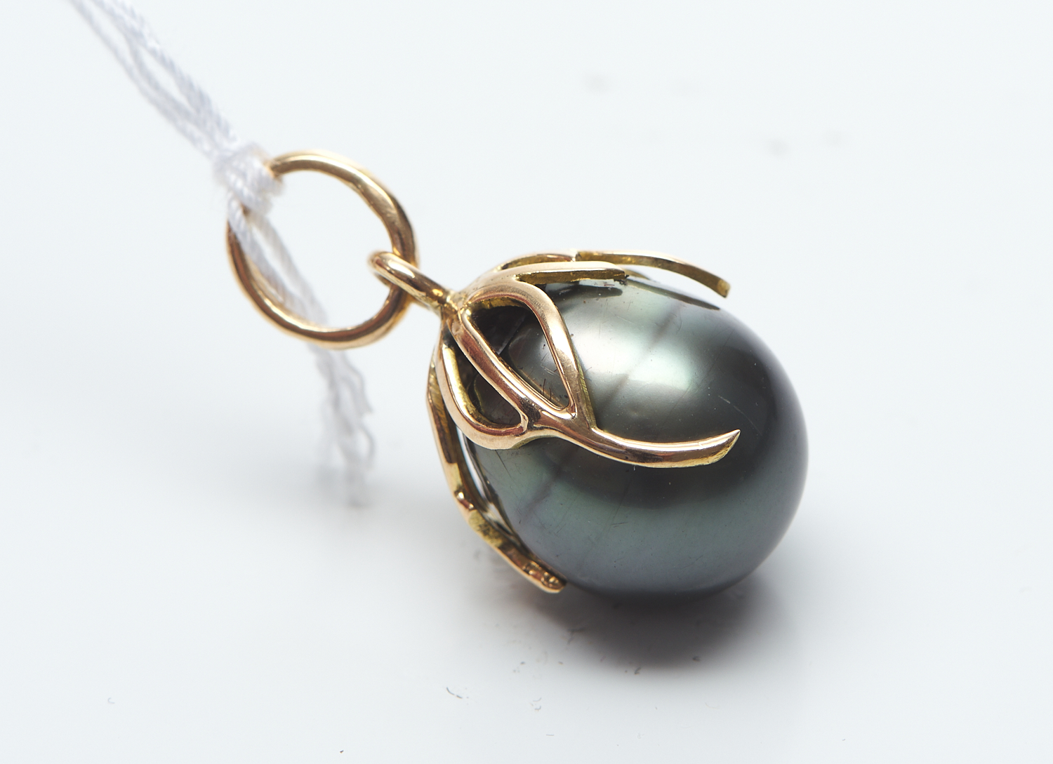 A TAHITIAN PEARL PENDANT IN ABSTRACT STYLE BALE IN 20CT GOLD, THE PEARL MEASURING 13.0MM