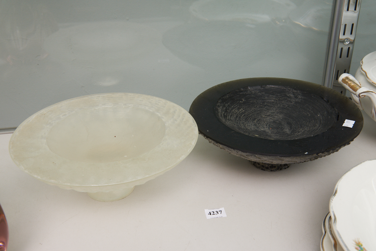 A PAIR OF TEXTURED GLASS COMPORTS, SIGNED BUTLER, 23 CM DIAMETER, LEONARD JOEL LOCAL DELIVERY SIZE: SMALL
