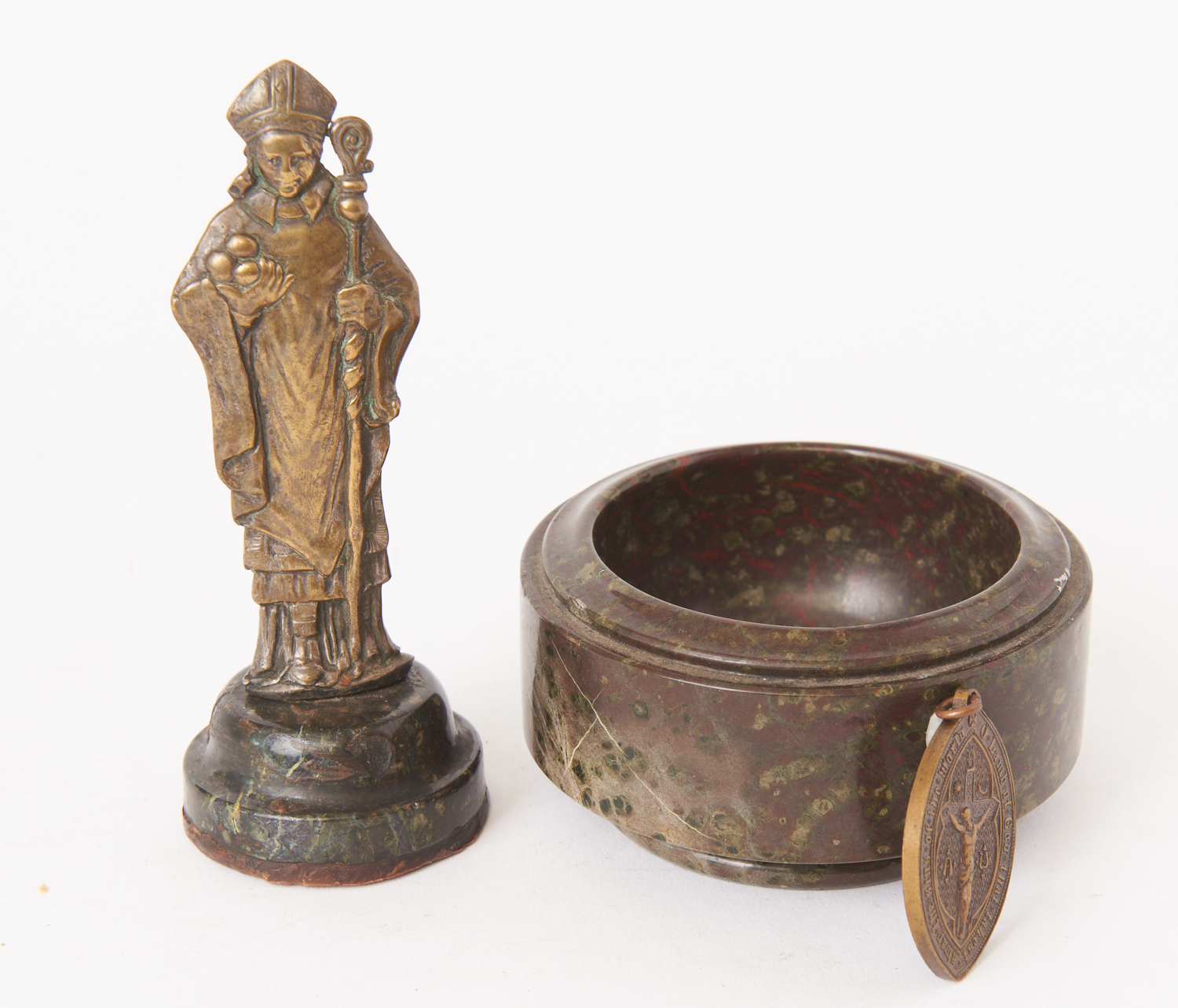 A BLOODSTONE BOWL, RELIGIOUS FIGURE AND PENDANT, H.17CM, LEONARD JOEL LOCAL DELIVERY SIZE: SMALL
