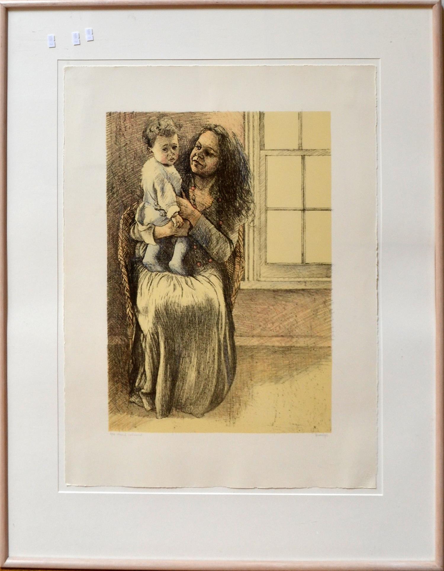 BRIAN DUNLOP, MOTHER AND CHILD, HAND COLOURED LITHOGRAPH 6/10, 56 X 41CM, FRAME SIZE: 104 X 81CM, LEONARD JOEL DELIVERY SIZE: LARGE, CONDITION: GOOD, MINOR HANDING CREASES AND MARKS