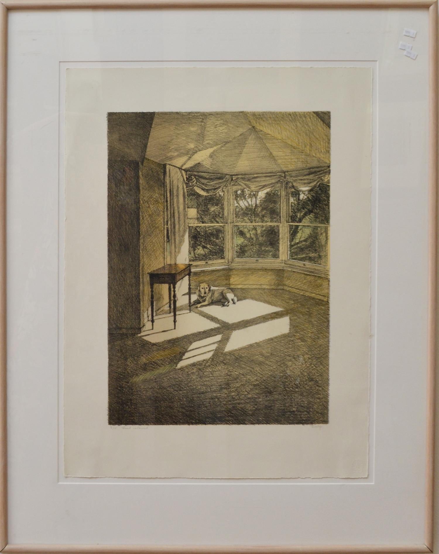 BRIAN DUNLOP, DOG SEATED IN SUN, HAND COLOURED LITHOGRAPH 4/15, 56 X 41CM, FRAME SIZE: 104 X 82CM, CONDITION: VERY GOOD, SCRATCHES TO PERSPEX, LEONARD JOEL DELIVERY SIZE: MEDIUM