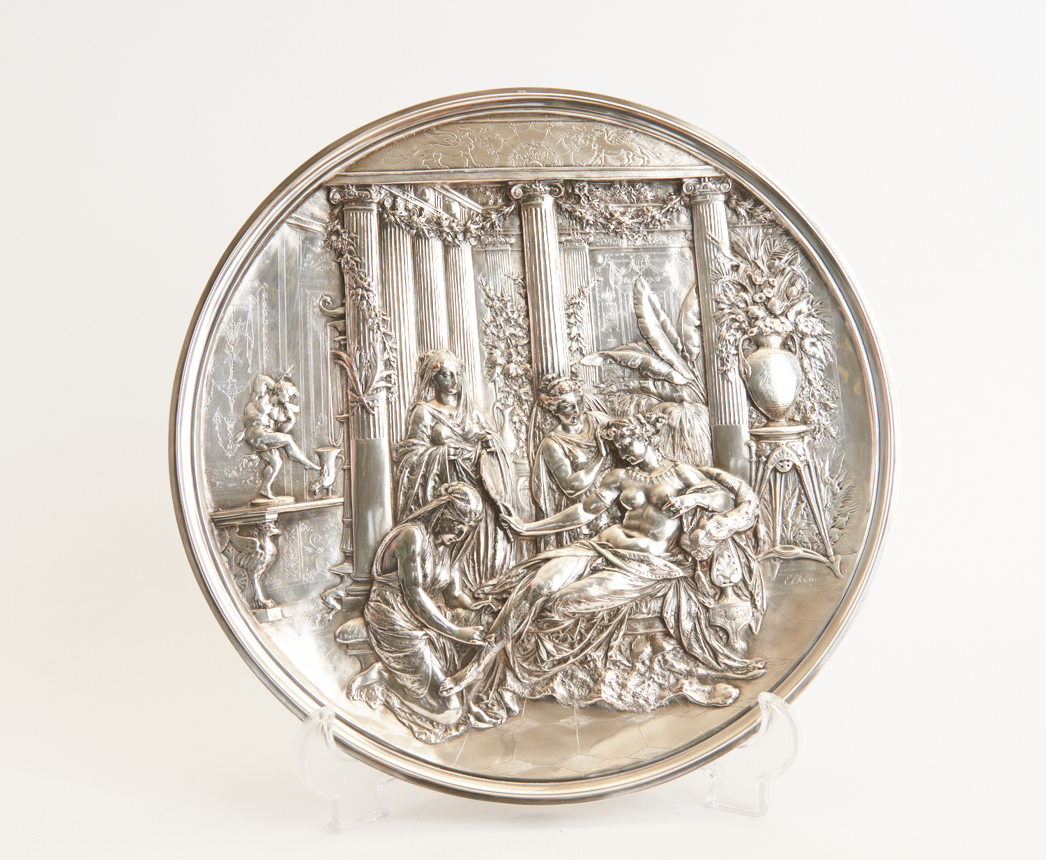 AN ELKINGTON VICTORIAN SILVERPLATE WALL PLAQUE, DIA.34CM, LEONARD JOEL LOCAL DELIVERY SIZE: SMALL