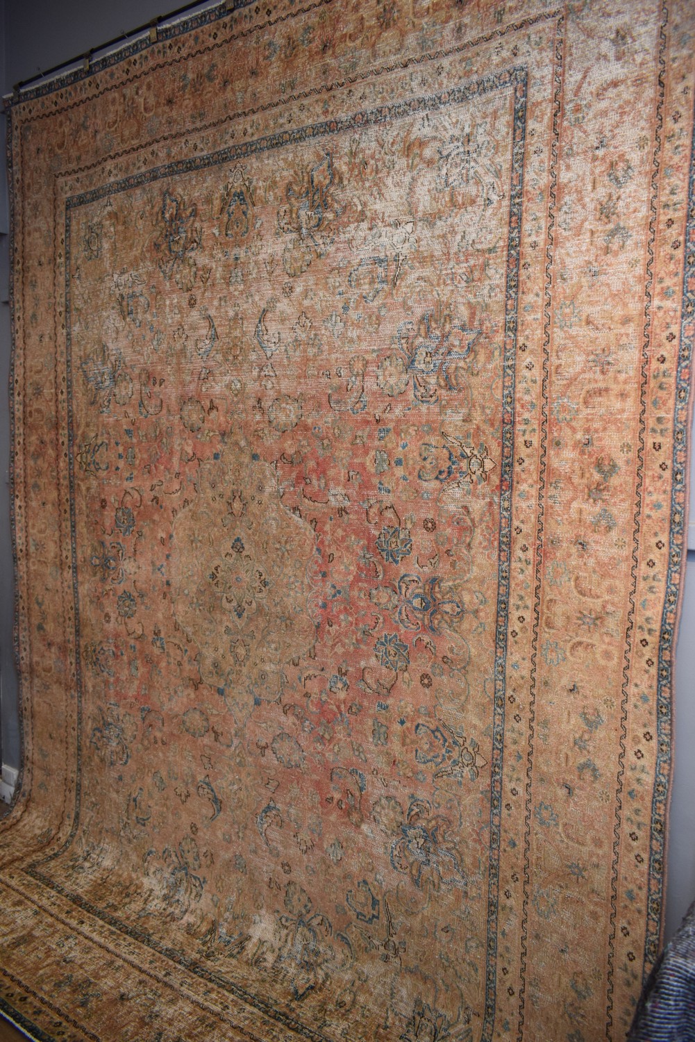 A SUPERB CONTEMPORARY VINTAGE OVER-DYED PERSIAN TABRIZ CARPET, SEMI-VINTAGE PILE. A UNIQUE MODERN CARPET CREATED FROM AN AUTHENTIC VINTAGE MEDALLION DESIGN TABRIZ CARPET WITH THE PILE SHORN AND OVER-DYED IN ROSE, BLUE & CREAM TONES. GALLERY EXHIBITED. CERTIFICATE OF AUTHENTICITY INCLUDED. SIZE: 383X285CMORIGIN: PERSIA - RRP: $7,900