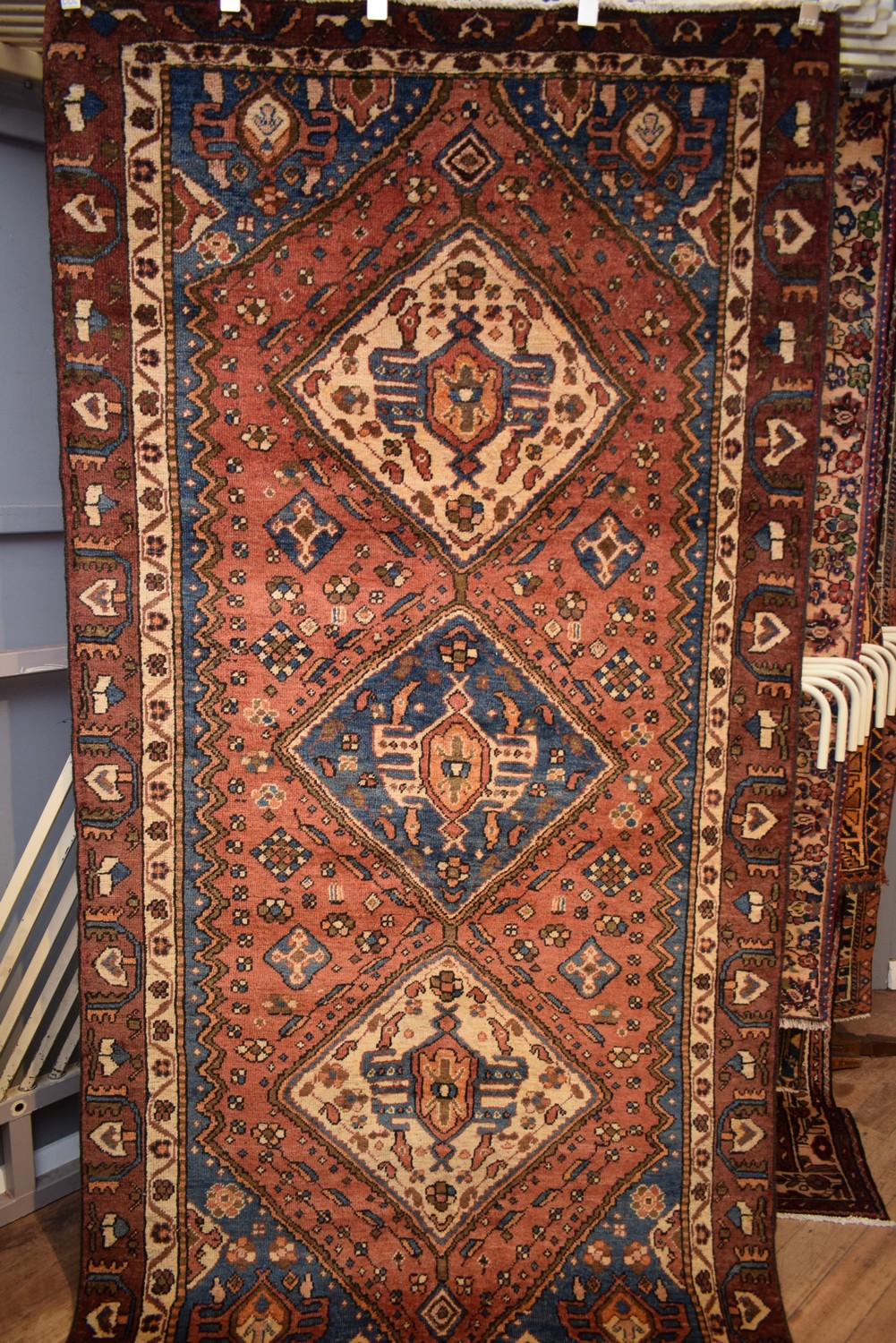 A RARE TRIBAL BAKHTIARI RUG. 100% WOOL. SOLID & HARD-WEARING. HAND-KNOTTED TRIBAL WEAVE WITH RARE QASHQAIE DESIGN OF TRIPLE BOLD MEDALLIONS CONTAINING AMULETES AND FLORAL PATTERNS IN A RED FIELD OF FLORAL PATTERNS AND A BORDER OF PALMETTES. GALLERY INVENTORY. IN EXCELLENT CONDITION. CERTIFICATE OF AUTHENTICITY INCLUDED. SIZE: 275X143CM ORIGIN: PERSIA - RRP: $2,200