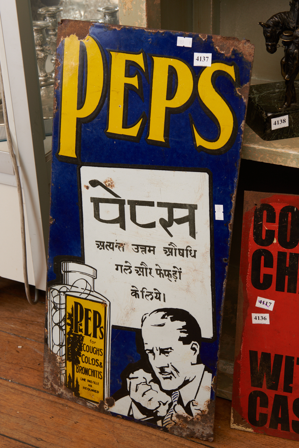 AN INDIAN ENAMEL SIGN ADVERTISING PEPS TABLETS FOR COUGHS AND COLDS, H.61CM, LEONARD JOEL LOCAL DELIVERY SIZE: SMALL