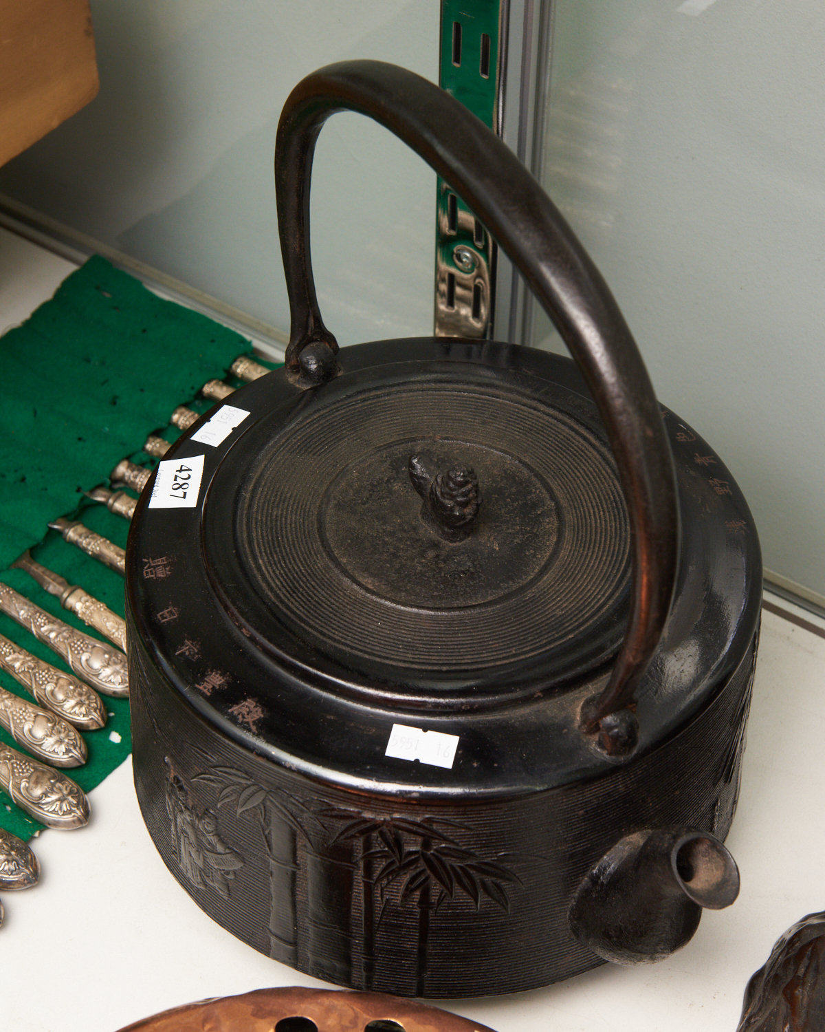 A C20TH JAPANESE CAST IRON TETSUBIN TEAPOT WITH RELIEF DETAILS AND WRITING, H.34CM, LEONARD JOEL LOCAL DELIVERY SIZE: SMALL