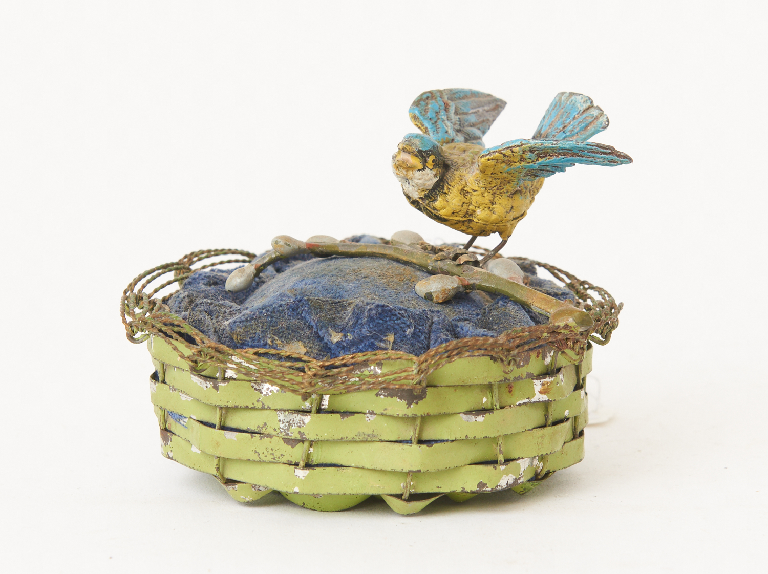 A 19TH CENTURY COLD PAINTED SPELTER AND METAL BIRD ADORNED PIN CUSHION, LEONARD JOEL LOCAL DELIVERY SIZE: SMALL