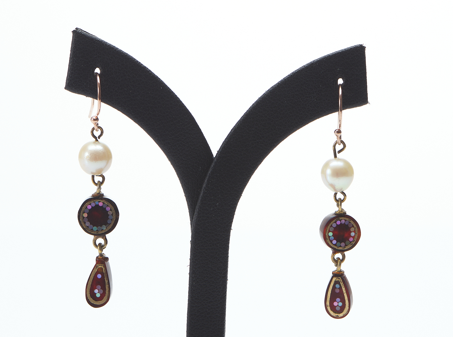 A PAIR OF PIQUÉ AND PEARL DROP EARRINGS, TO SHEPHERD HOOK FITTINGS IN SILVER GILT, LENGTH 40MM