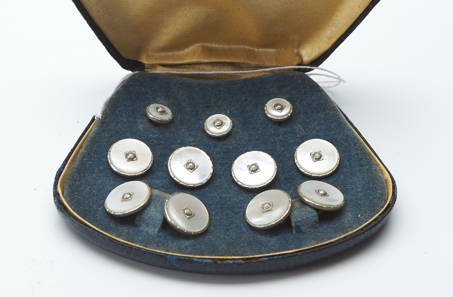 A VINTAGE BOXED SET OF GOLD LINED CUFFLINKS, SHIRT STUDS AND BUTTONS FEATURING MOTHER-OF-PEARL