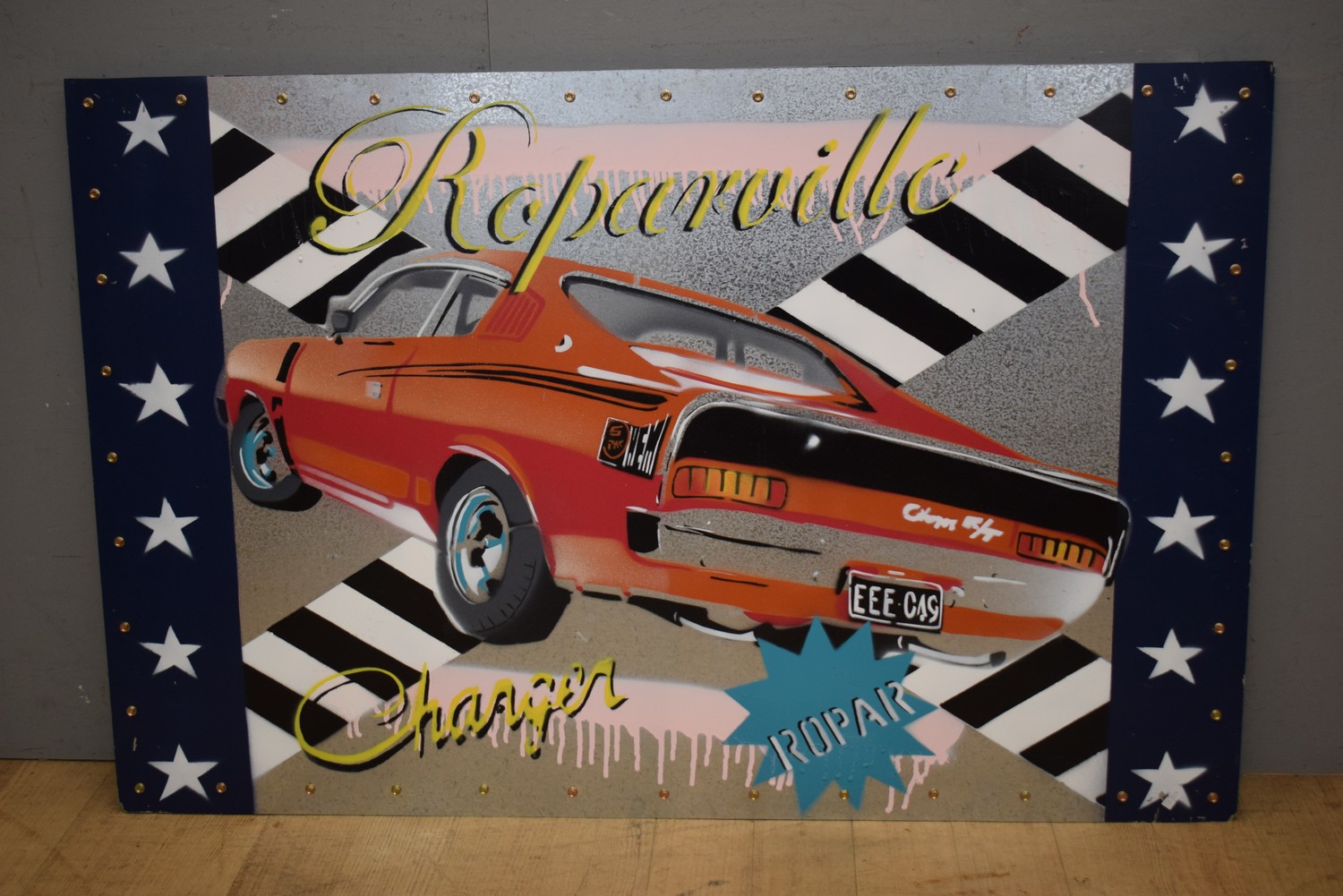 A RETRO ROPAR HAND PAINTED ORANGE CHARGER GTS ON METAL SHEET (80H x 123W CM) (LEONARD JOEL DELIVERY SIZE: LARGE)