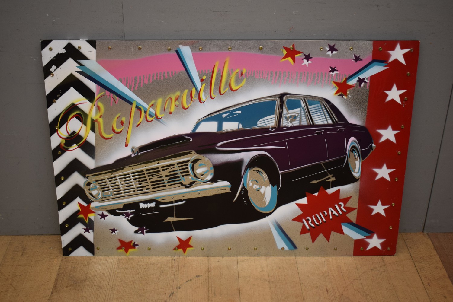 RETRO ROPAR HAND PAINTED PURPLE MUSCLE CAR ON METAL SHEET (80h X 122w cm) (LEONARD JOEL DELIVERY SIZE: LARGE)