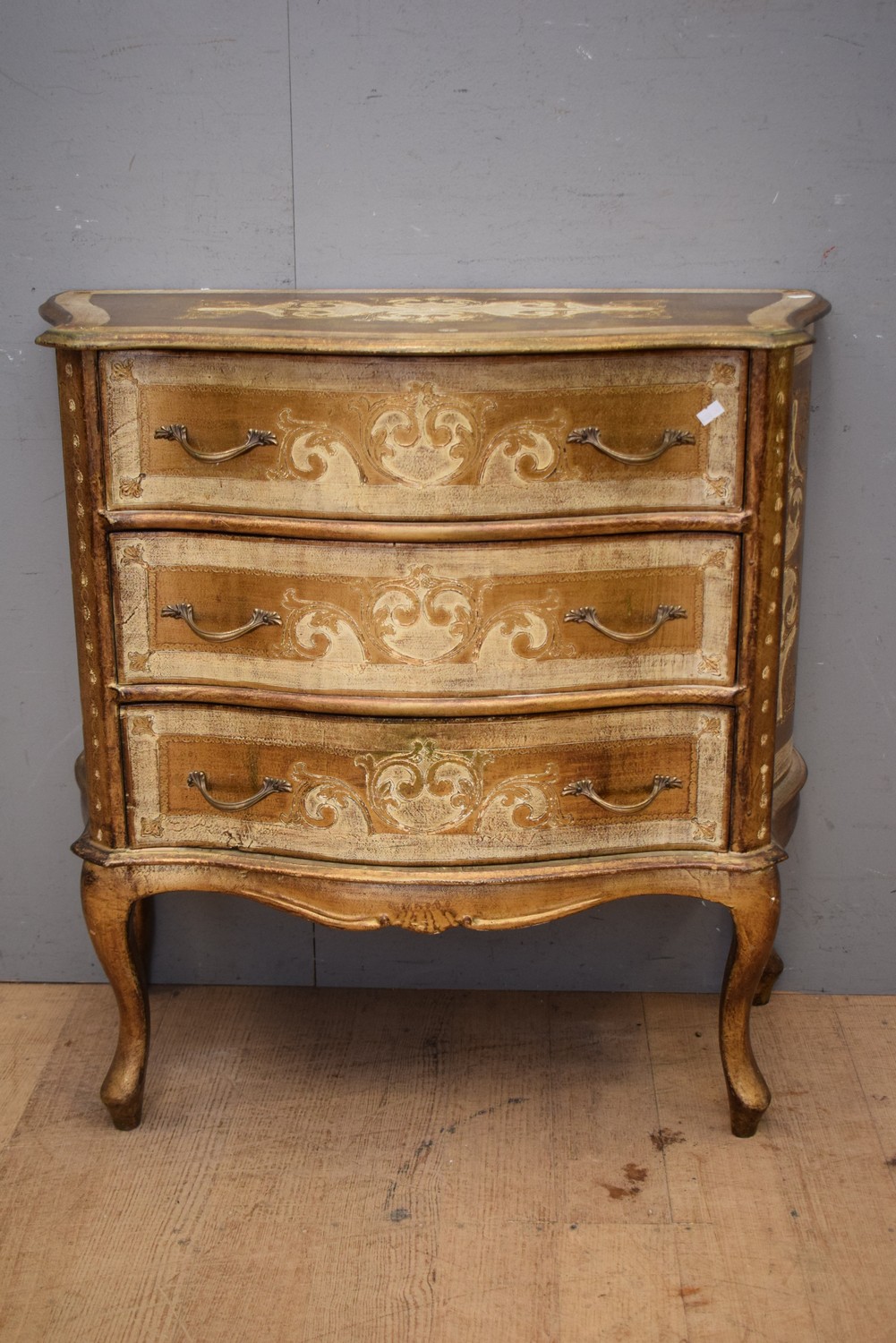 FINE LARGE 1900S FLORENTINE ITALIAN GILTWOOD 3 DRAWER CHEST OF DRAWERS WITH BOW FRONT PROFILE (H80 X W79 X D38 CM) (LEONARD JOEL DELIVERY SIZE: LARGE)