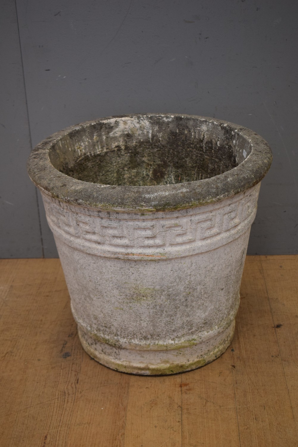 LARGE 1940S AUSTRALIAN CONGRETE GARDEN POT WITH GREEK KEY PATTERN (H44 X D51 CM) (PLEASE NOTE THIS HEAVY ITEM MUST BE REMOVED BY CARRIERS AT THE CUSTOMER'S EXPENSE. LEONARD JOEL STAFF CANNOT ASSIST CARRYING THIS ITEM) (X-LARGE ITEM)