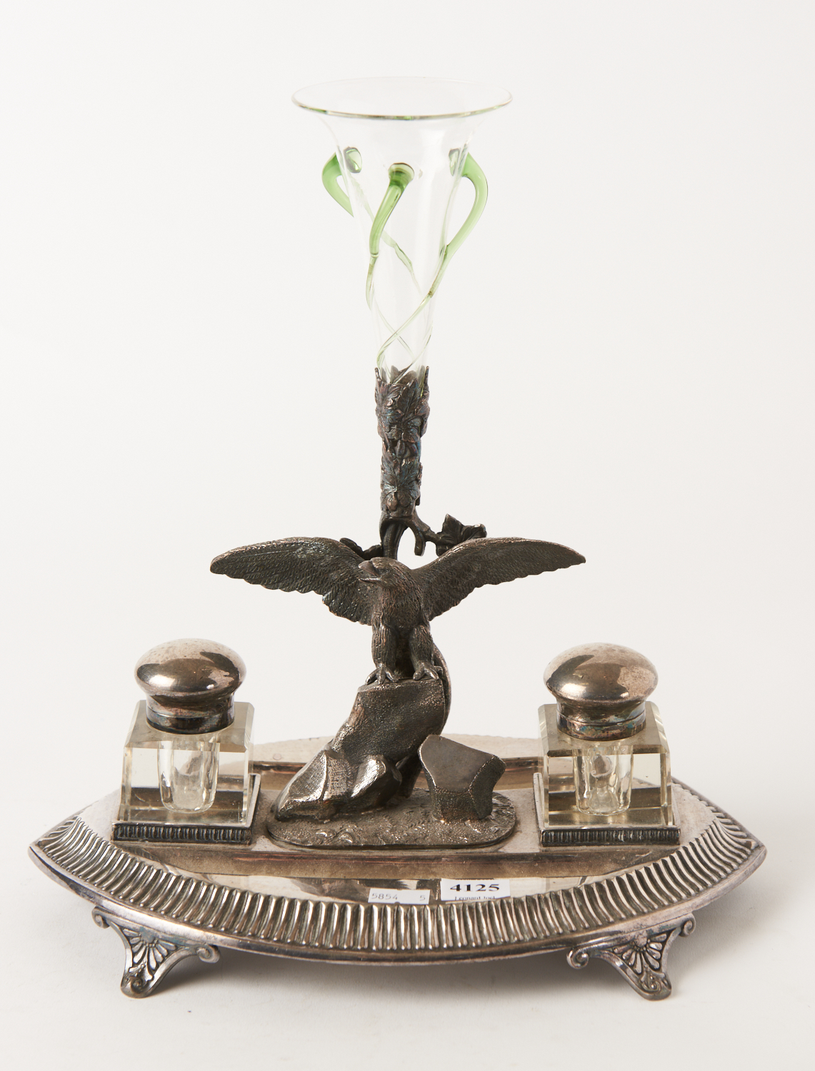 A VICTORIAN SILVERPLATE COMBINATION INKSTAND EPERGNE WITH EAGLE MOTIF, JAMES DEAKIN & SONS, (SOME LOSSES TO CORNERS OF THE INKWELLS), H.31CM, LEONARD JOEL LOCAL DELIVERY SIZE: SMALL