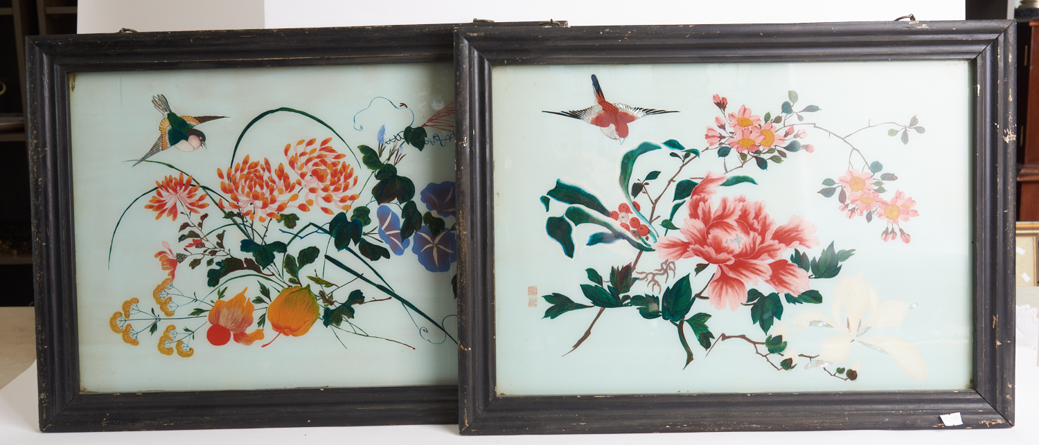 A PAIR OF CHINESE REVERSE GLASS PAINTINGS, FIRST HALF 20TH CENTURY, SEAL MARKS TO BOTH, W.57CM, LEONARD JOEL LOCAL DELIVERY SIZE: SMALL
