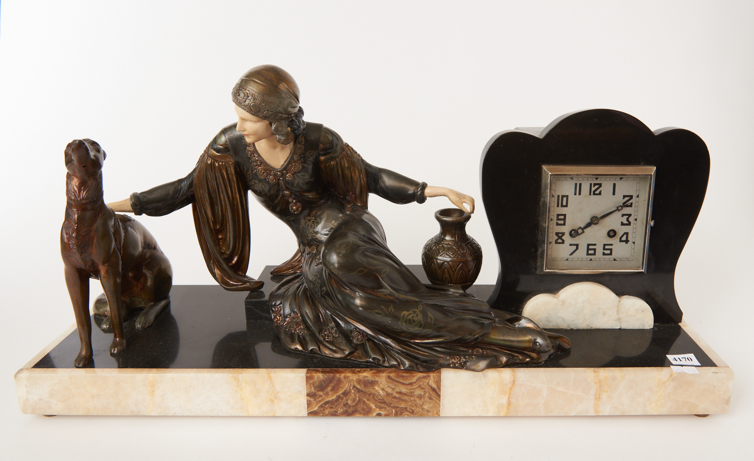 A FRENCH PATINATED BRONZE FIGURAL CLOCK, LADY WITH GREYHOUND, CIRCA 1930, ATTRIBUTED TO MENEVILLE, LEONARD JOEL LOCAL DELIVERY SIZE: SMALL