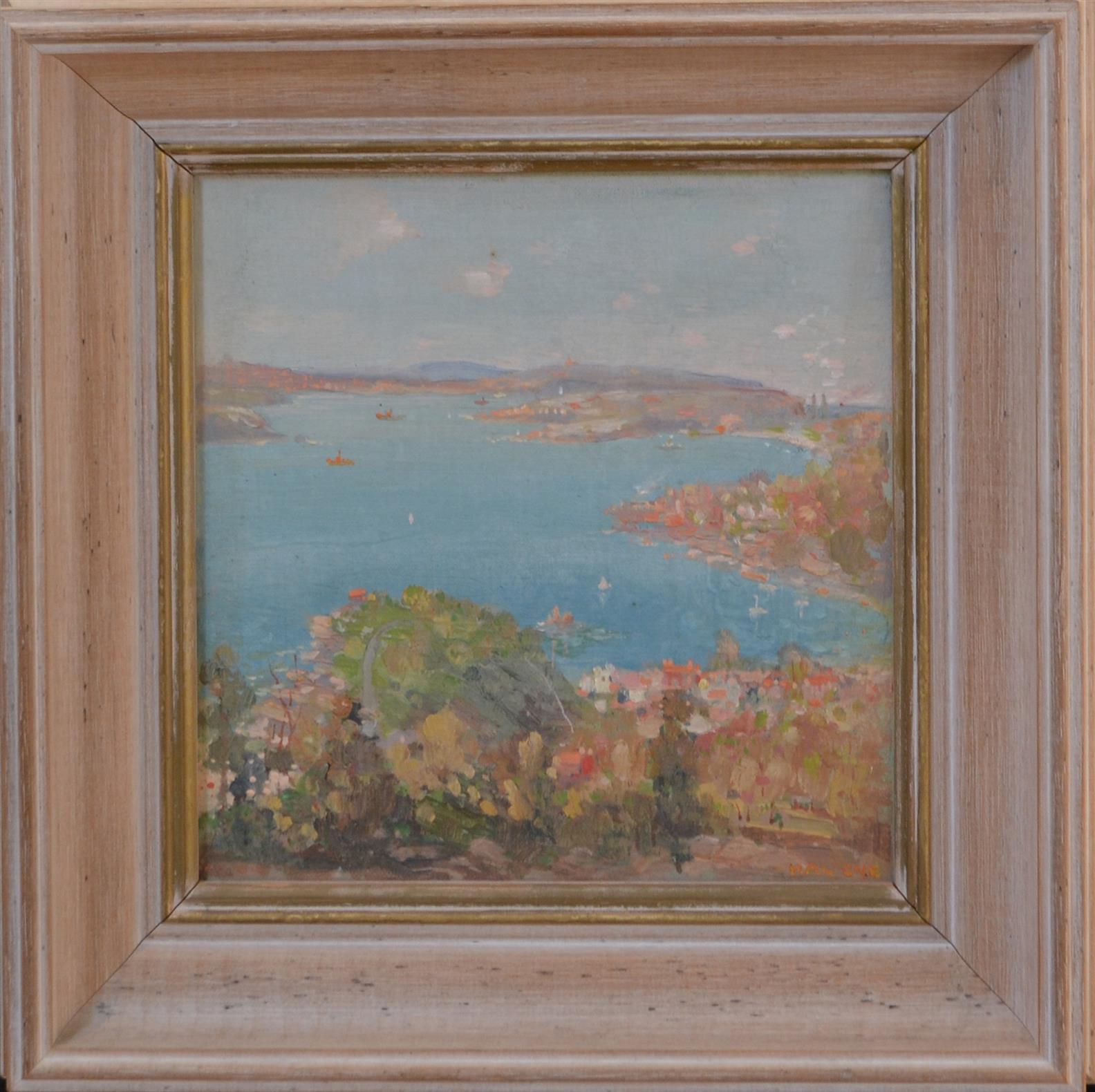 HAL GYE, SYDNEY HARBOUR, OIL ON CANVASBOARD, 19.5 X 19CM; FRAMED: 30 X 29.5CM, LEONARD JOEL DELIVERY SIZE: SMALL