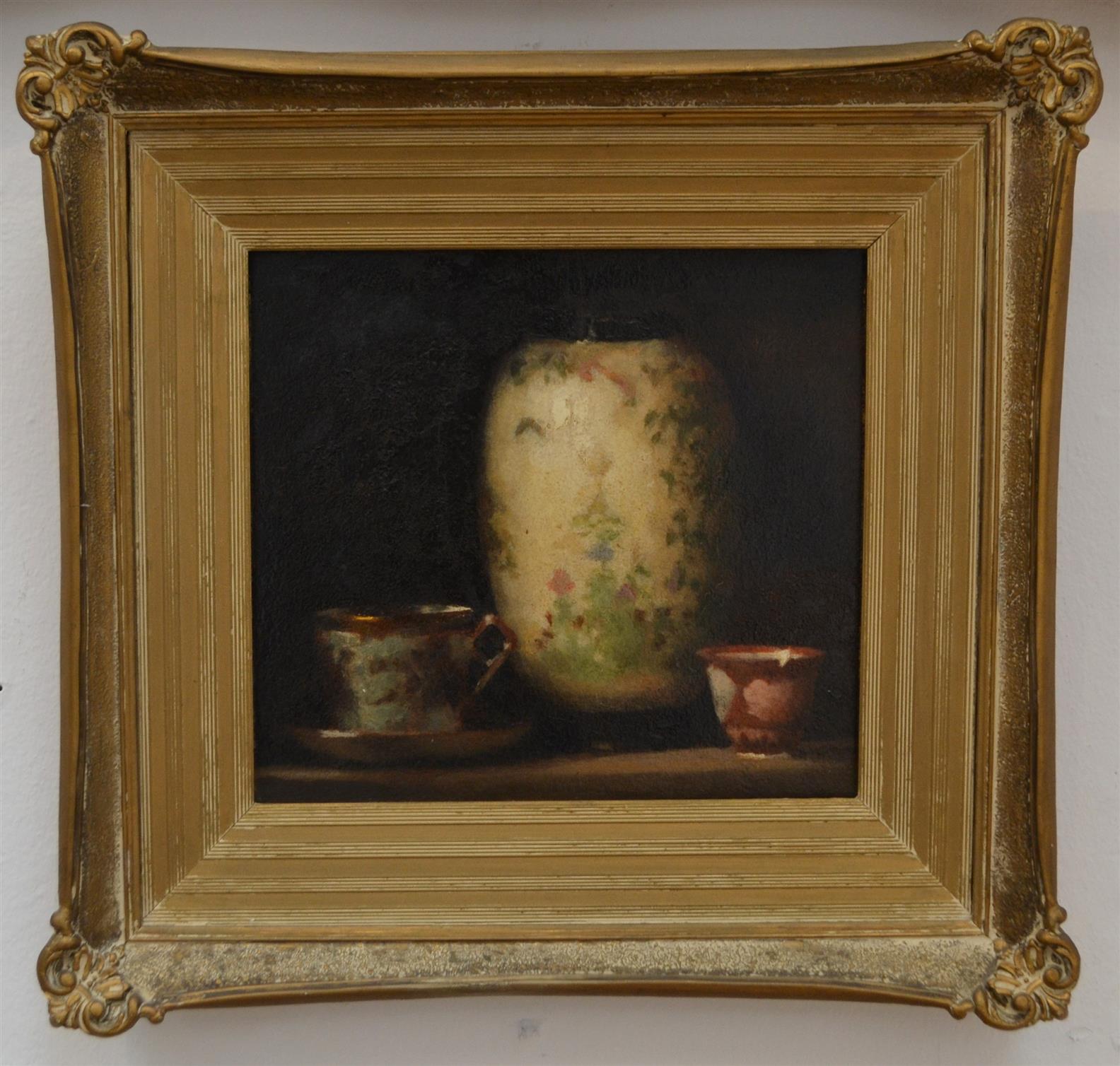 ATTRIBUTED TO MAX MELDRUM, VASE AND TWO CUPS, OIL ON BOARD, SIGNED INDECIPHERABLY UPPER RIGHT: M.M_/ 23 X 26CM; FRAMED: 40 X 42CM; CONDITION: THE WORK HAS HAD PREVIOUS REPAIR WORK, VISIBLE TO THE NAKED EYE