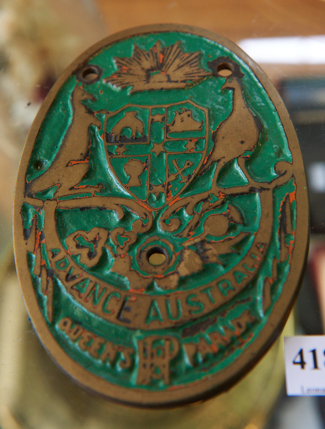 A MANUFACTURERS MACHINERY NAME PLATE FANTASY COAT OF ARMS, VICTORIAN COLONIAL PERIOD H.15CM, LEONARD JOEL LOCAL DELIVERY SIZE: SMALL