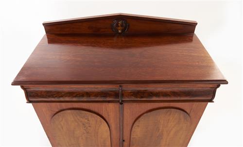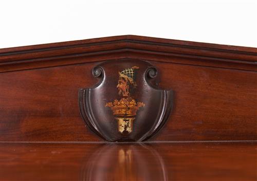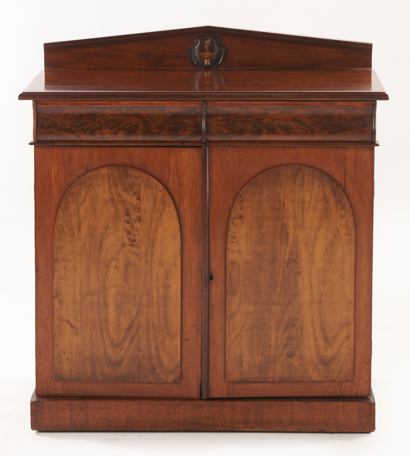 The triangular pediment bearing a painted family crest, above two drawers, and arched panel doors