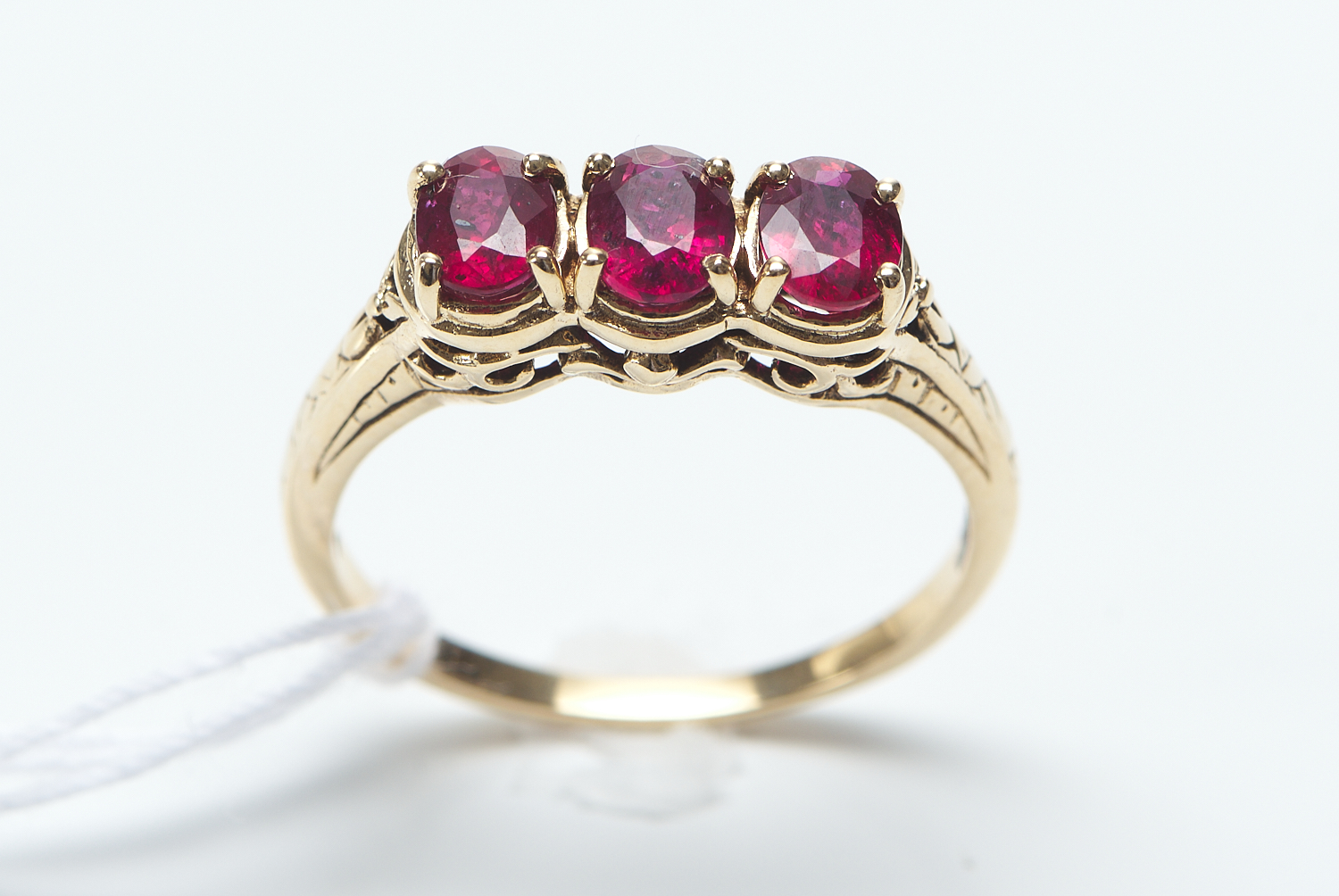 A THREE STONE RUBY RING IN 9CT GOLD, FEATURING THREE OVAL RUBIES TOTALLING 1.42CTS, SIZE N-M, 2.5GMS