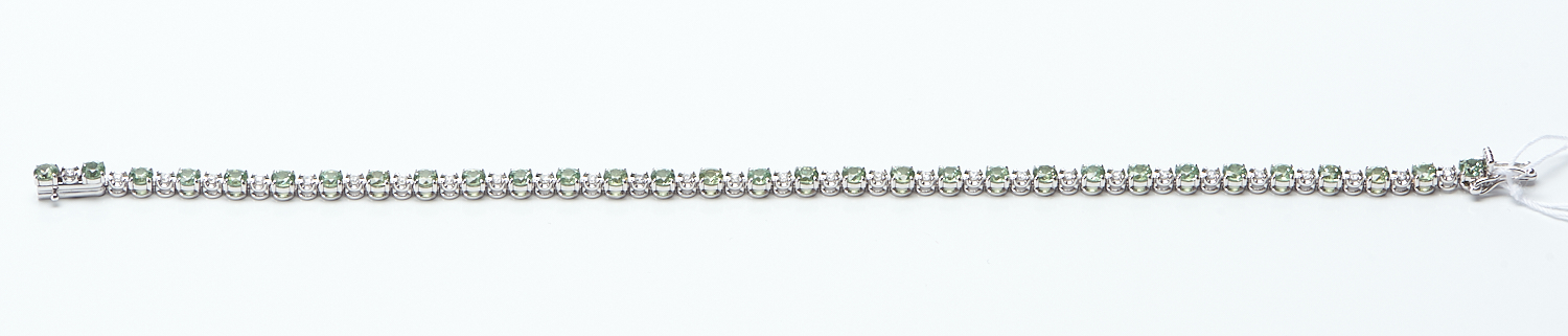 A DEMANTOID GARNET LINE BRACELET IN 18CT WHITE GOLD, COMPRISING THIRTY ONE ROUND BRILLIANT CUT DEMANTOID GARNETS TOTALLING 4.53CTS, SPACED WITH ROUND BRILLIANT CUT DIAMONDS TOTALLING 0.30CT, LENGTH 180MM, 7.8GMS
