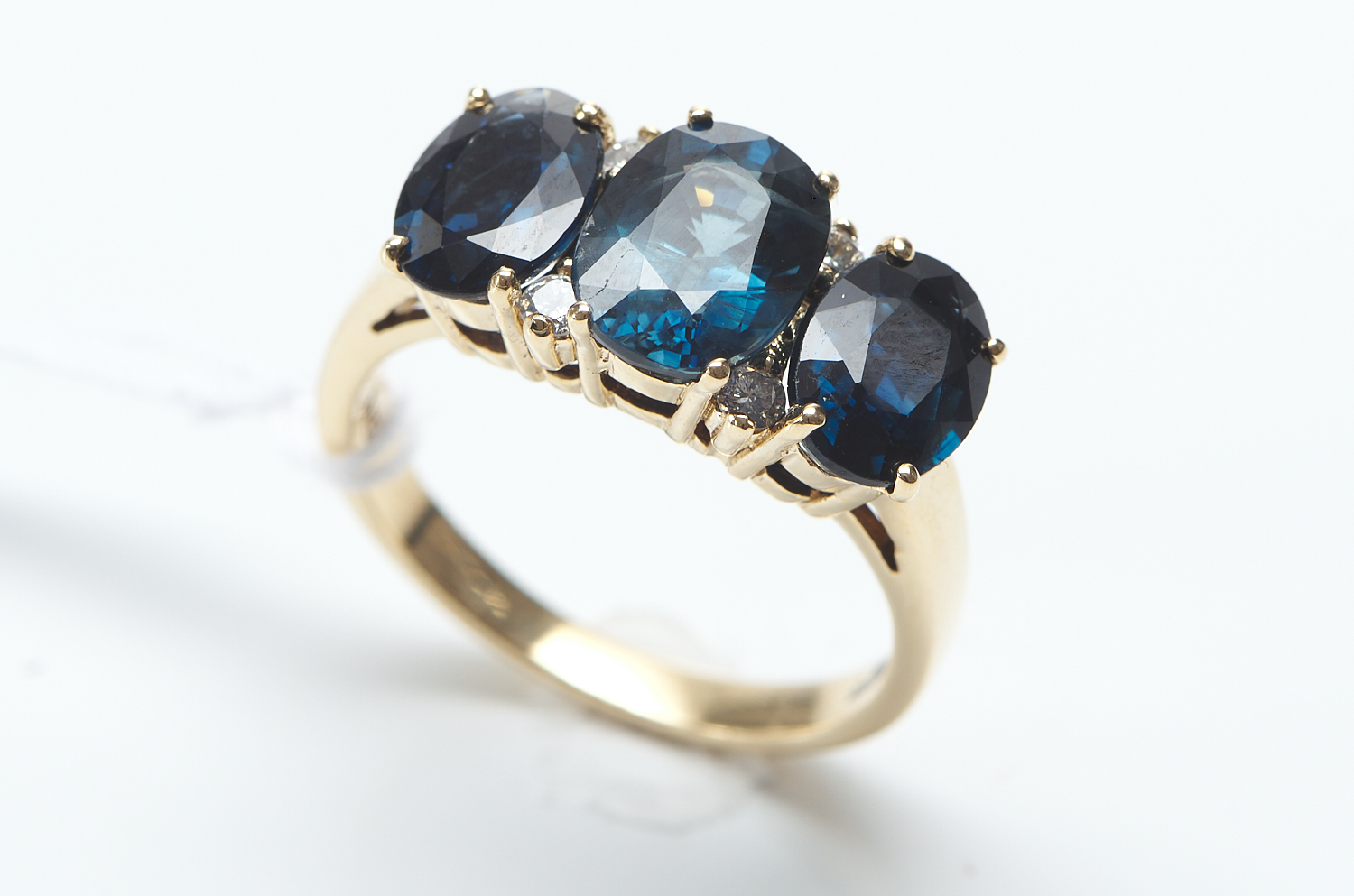 A SAPPHIRE AND DIAMOND DRESS RING, FEATURING THREE OVAL BLUE SAPPHIRES TOTALLING 5.23CTS, SPACED BY FINE DIAMOND DETAIL, IN 9CT GOLD, RING SIZE N, 4.1GMS