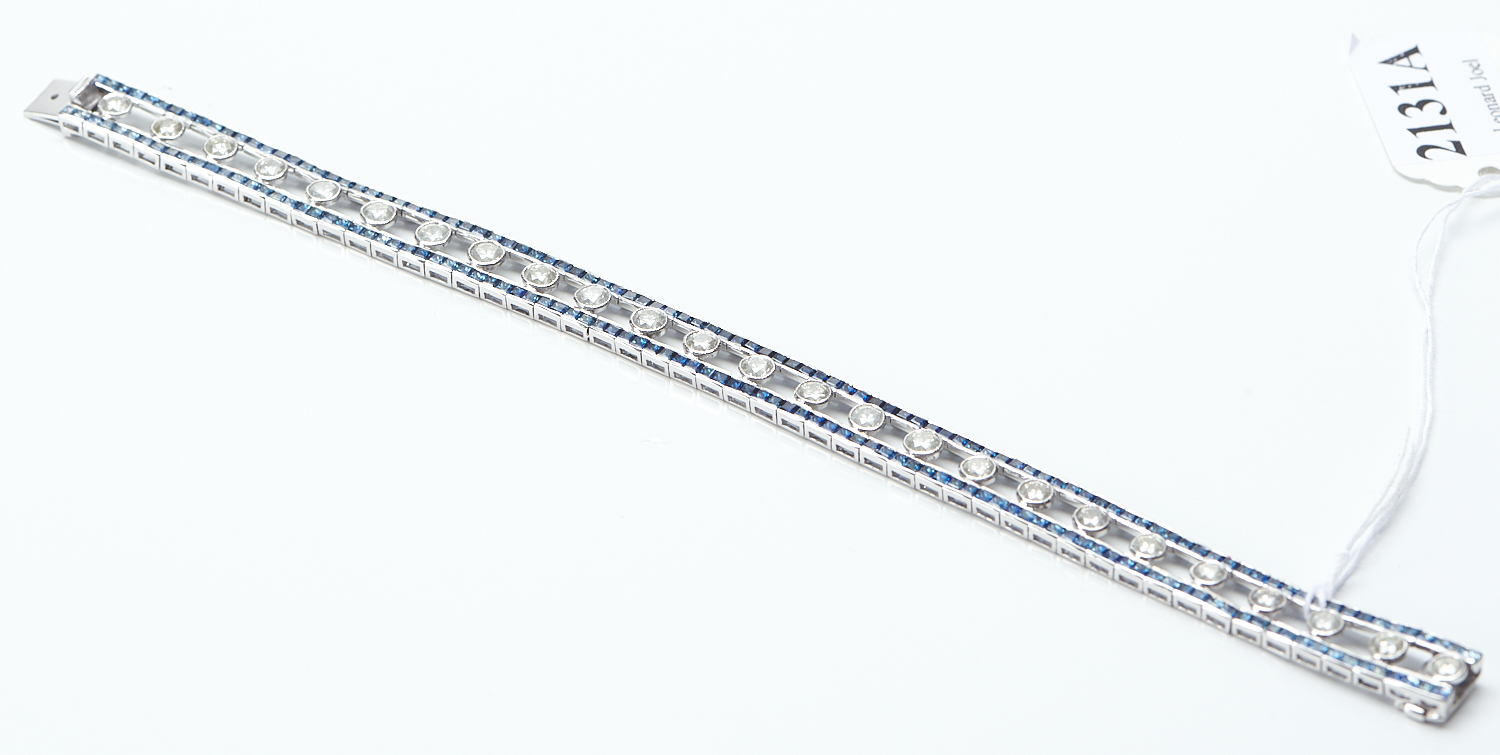 A DIAMOND AND SAPPHIRE BRACELET IN 18CT WHITE GOLD, COMPRISING TWENTY-FIVE ROUND BRILLIANT CUT DIAMONDS TOTALLING 4.93CTS, WITHIN A DOUBLE BORDER OF CARRÉ CUT BLUE SAPPHIRES TOTALLING 24.68CTS, TOTAL LENGTH 185MM, 15.5GMS