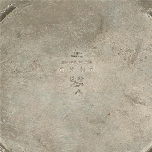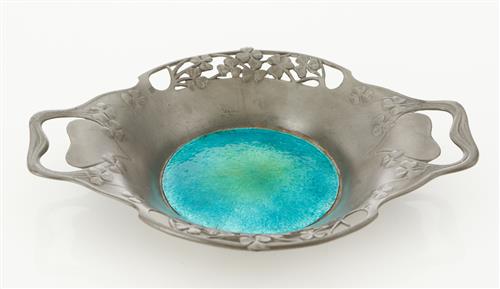 With decorative pierced heart-shaped handles and pierced shamrocks around the edges, the base enamelled in vibrant peacock blue, marked to verso 'Made in England/ English Pewter/ 0287/ Solkets'