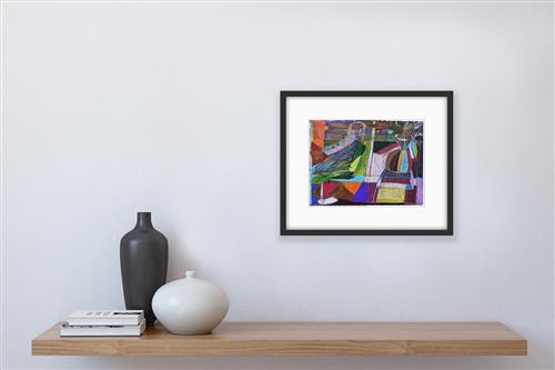 In this artwork by Suzanne Barnes the brightly coloured imagery conveys an almost cubist feel, the fragmented and abstracted scene busy and playful.