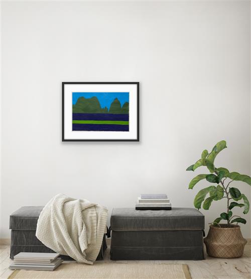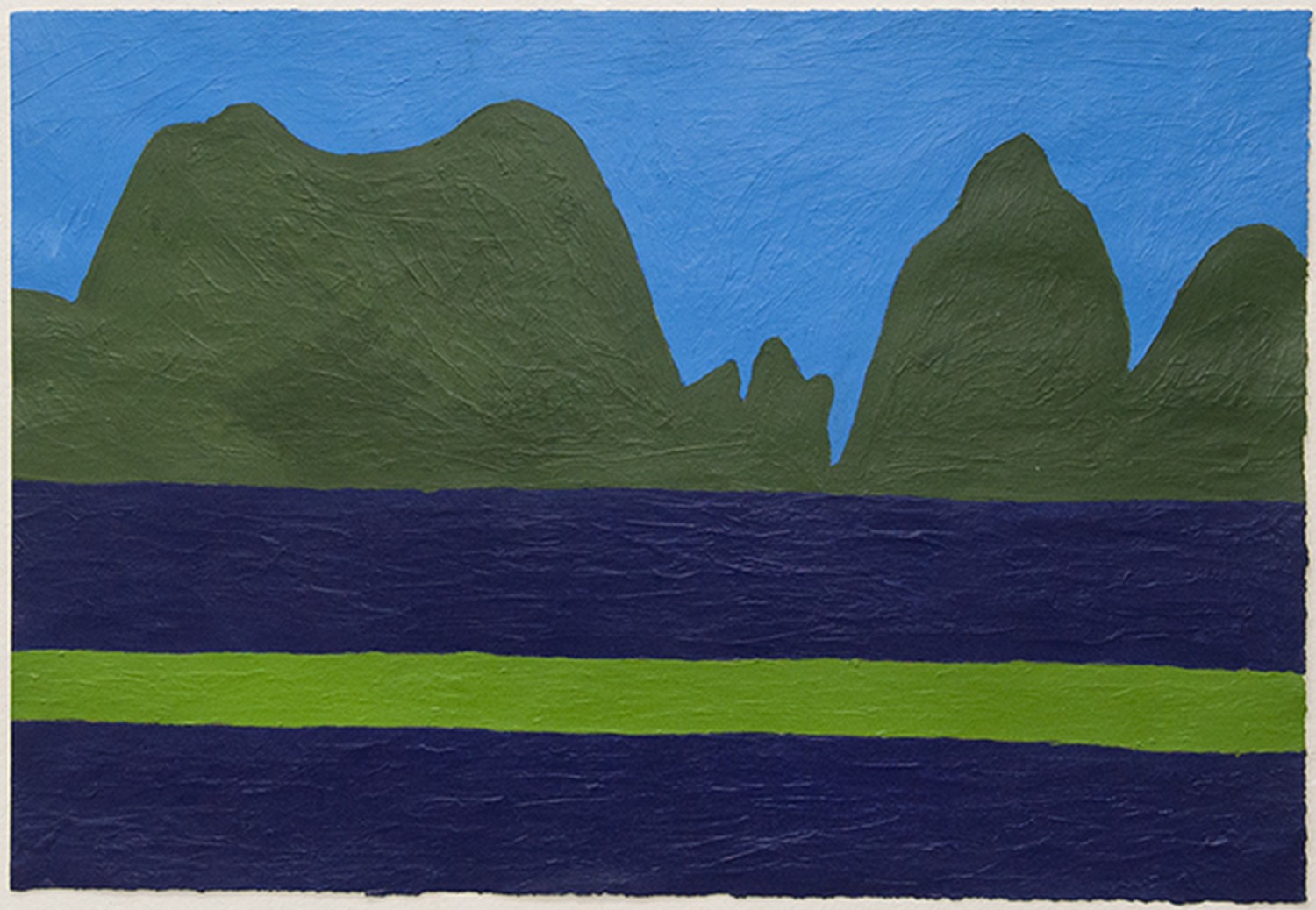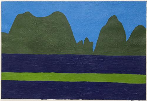 John Bates is a painter whose striking, delineated composition are characterised by flat planes and vivid colour. Through the use of a minimal palette emphasising the two-dimensional surface, the work plays with ordinary perception of landscapes and seascapes. His process involves creating a dense surface by repeated application of acrylic colour.