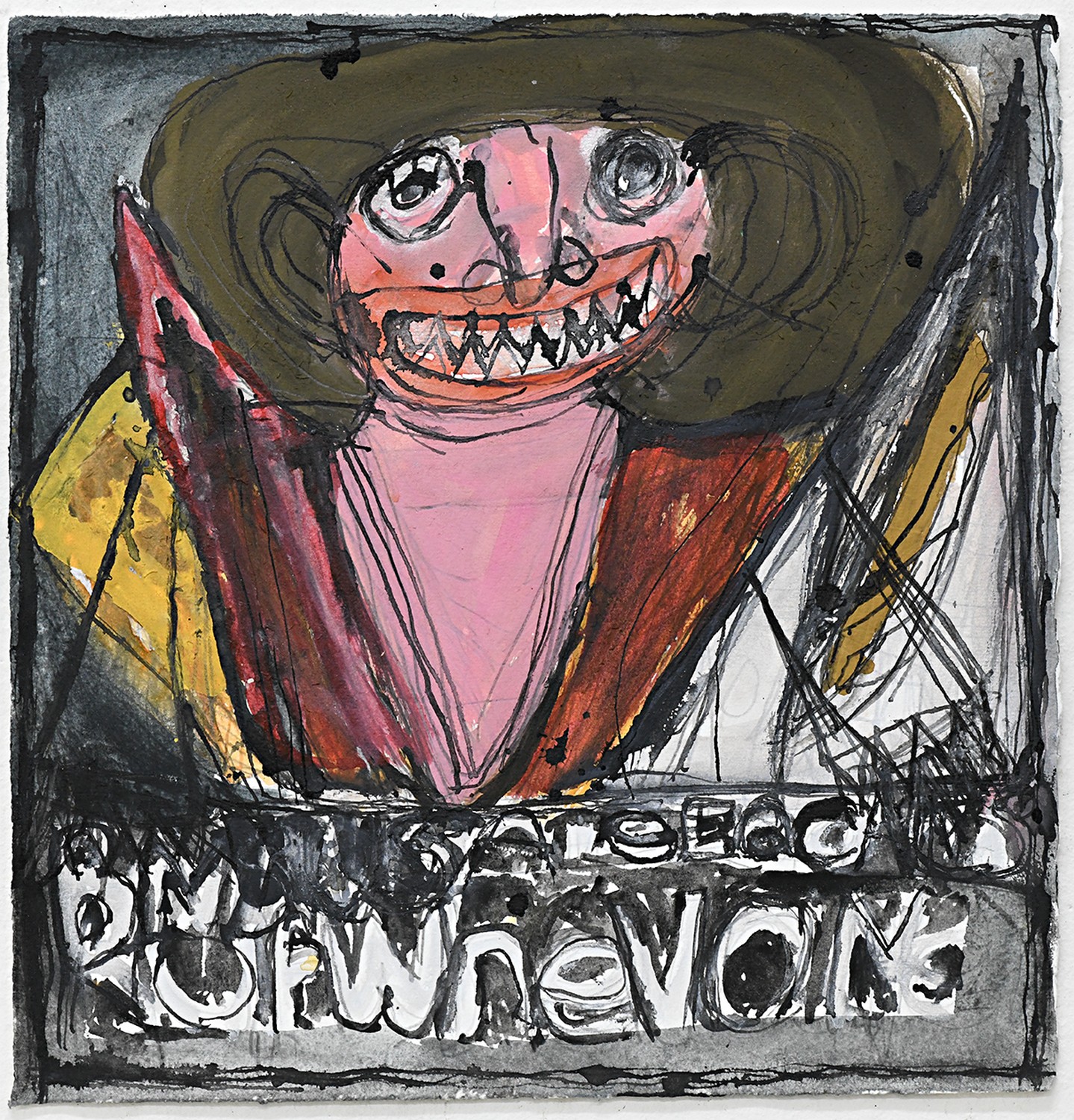 Monica Burns is a mid-career figurative painter who works on an intimate scale with pencil, ink, watercolour paint and gouache on paper. Drawing inspiration from musicals, theatre brochures, landscapes and people, she creates complex compositions of frenetic lines that connect and overlap, resulting in dark yet beautiful artworks.
