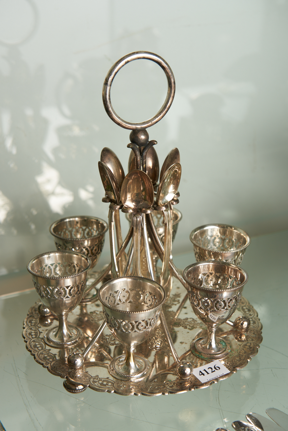 A SILVER PLATE EGG CRUET SET FOR SIX, LEONARD JOEL LOCAL DELIVERY SIZE: SMALL